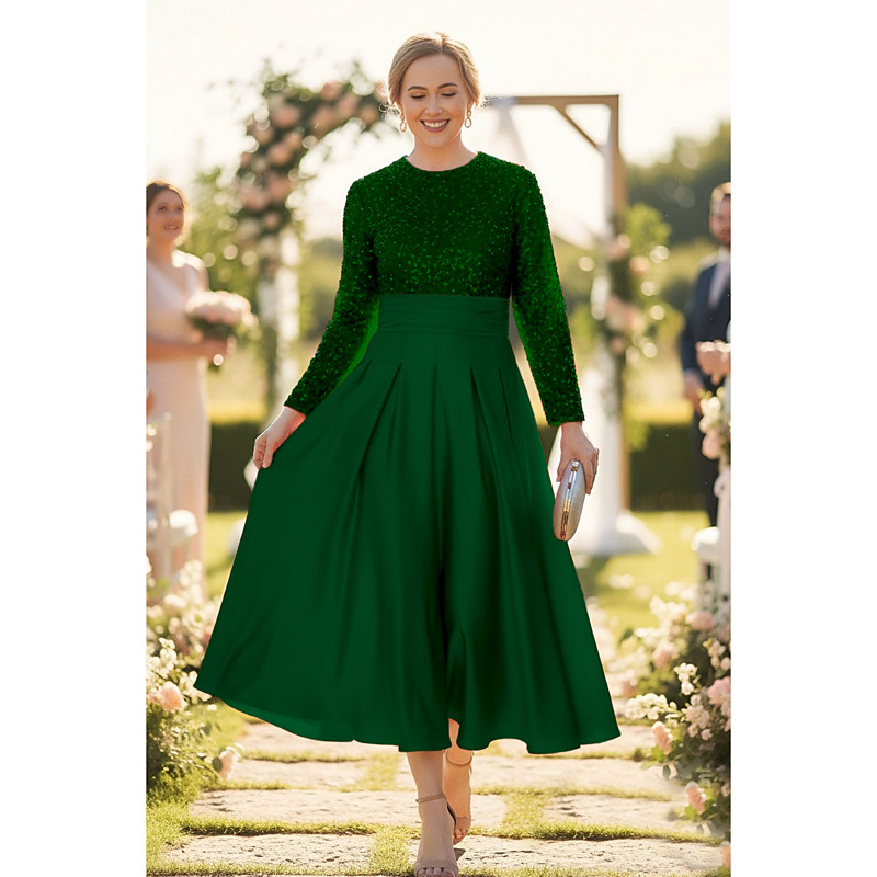 A-Line Ankle Length Tea Length Party Dress Cocktail Dress Wedding Guest Dress Mother of the Bride Dress Long Sleeve Crew Neck Elegant Sparkle Shine Formal Wedding Guest Satin Sequined with Pleats