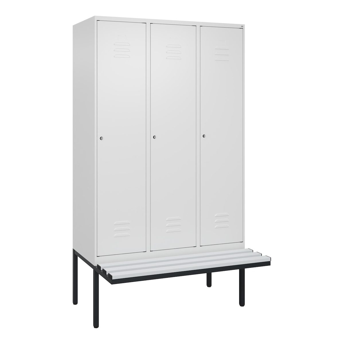 C+P Spind Classic PLUS, Kunststoff schwebende Sitzbank, 3 Abteile, HxBxT 212x120x82cm, Zylinderschloss, Verkehrsweiß von PROREGAL
