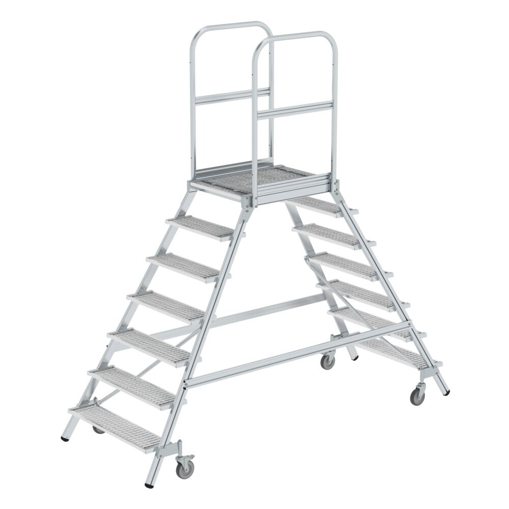 PROREGAL Podesttreppe beidseitig begehbar mit Federrollen | Stahl-Gitterrost | 7 Stufen | Rutschsichere Leiterschuhe