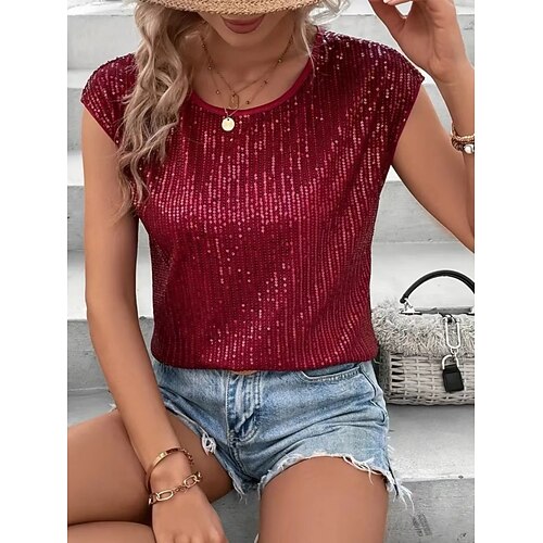 Per donna Blusa Tinta unica Elegante Casual Manica Corta Girocollo Top corti Quotidiano Paillettes Nero Champagne Vino Blu Reale Grigio Estate Primavera