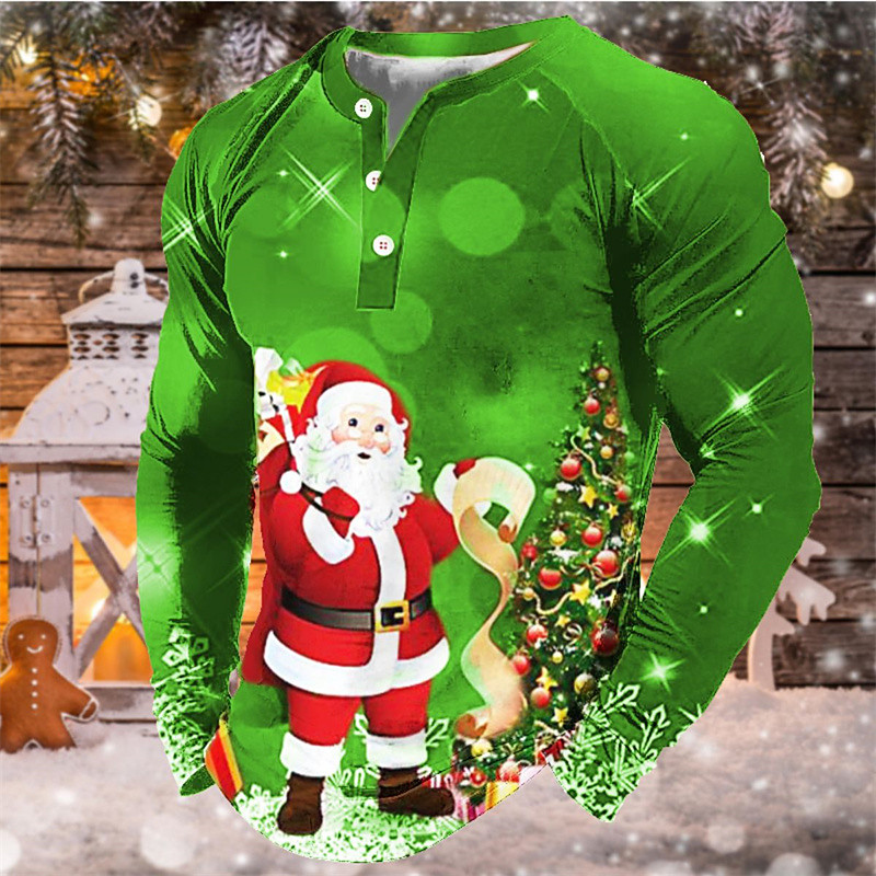 Christmas T Shirt Men's Henley Shirt T shirt Tee Tee Graphic Santa Claus Henley Green Blue Orange Red 3D Print Outdoor Christmas Long Sleeve Patchwork Button-Down Clothing Apparel Basic Designer
