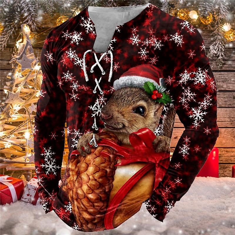 Christmas T Shirt Men's T shirt Tee Tee Graphic Squirrel Collar Green Blue Red 3D Print Outdoor Christmas Long Sleeve Lace up Print Clothing Apparel Basic Designer Casual