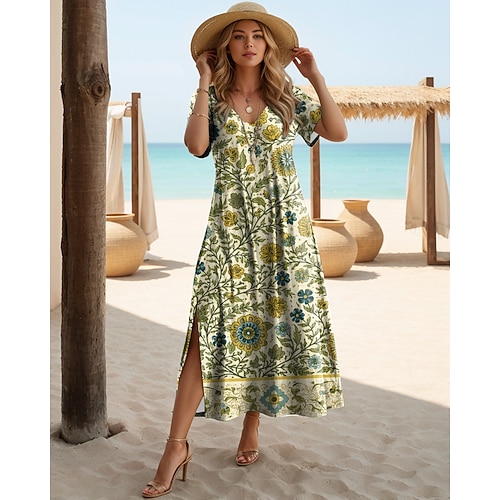 Per donna Abito maxi Abito a trapezio Casual Quotidiano Spiaggia Vestibilità comoda Geometrico Manica Corta Scollo a V Blu Marrone Scuro Verde chiaro Rosso Estate Primavera