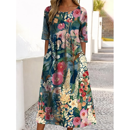 Per donna Abito Midi Vestito Casual Abito Stampato Vintage All'aperto Vacanza Uscire Vestibilità comoda Floreale Grafico Mezza Manica Girocollo Blu Viola chiaro Viola Verde Estate Primavera