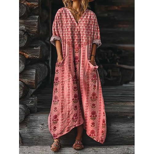 Per donna Abito maxi Abito Boho Vestito Casual Abito Stampato Vintage All'aperto Vacanza Weekend Vestibilità comoda Floreale Manica Lunga Scollo a V Rosa Estate Primavera Autunno