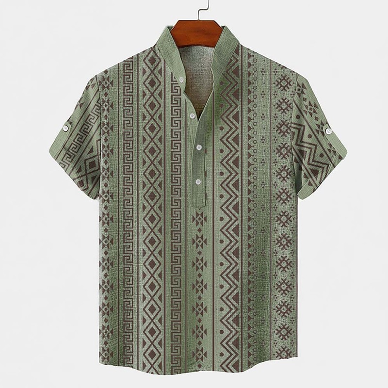 Men's Geometric Greek Key Meander Shirt Button Down Shirt Short Sleeve Vintage Retro Holiday Casual Daily Summer Spring Standing Collar Henley Collar 3D Print Linen Like Shirt Dark Khaki Green Khaki