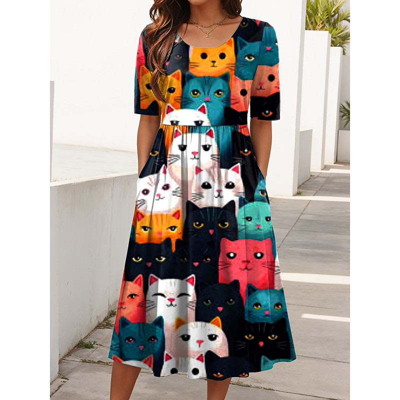 Women's Midi Dress Summer Dress Pleated Dress Vacation Casual Holiday Regular Fit Graphic Animal Cat Half Sleeve Crew Neck Black White Brown Summer Spring
