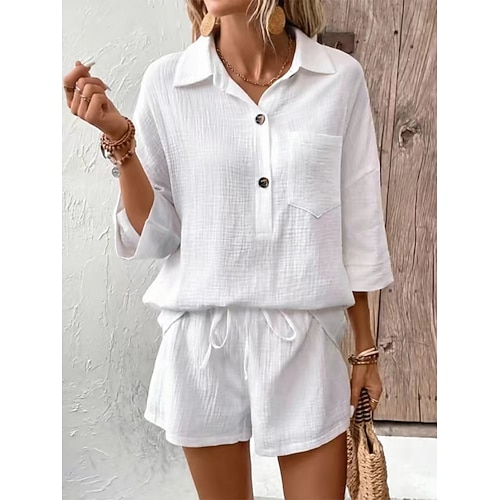 Per donna Set da due pezzi Camicia di cotone Set di Pantaloncini Manica Lunga Colletto a Camicia Semplice Moda Streetwear Casuale Quotidiano All'aperto Nero Bianco Blu marino Estate Vestibilit