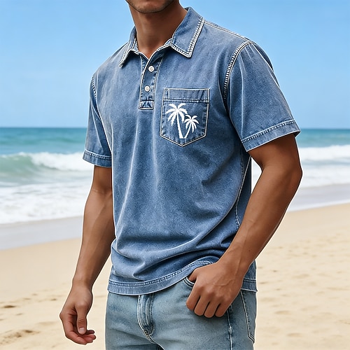 Herren Palme Acid-Wash-Shirt 100% Baumwolle Kurzarm Polo-Shirts Revers Hawaiianisch Lässig Athleisure Urlaubskleidung Tasche 3D-Druck Knöpfe Frühling Sommer Blau Rote Grün