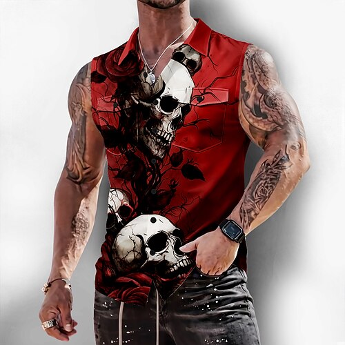 Herren Horror Rose Totenkopfe Hemd Knopfhemd Ärmelloses Shirt Ärmellos Dunkler Gothic-Stil Outdoor Lässig Sommer Frühling Umlegekragen 3D-Druck Zwei Fronttaschen Blau Rote Purpur Grün