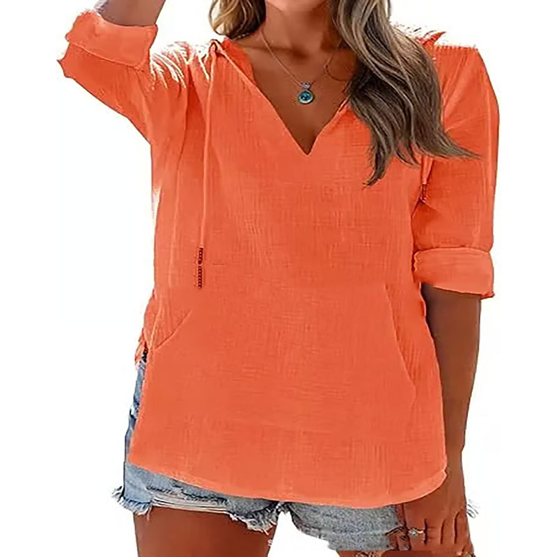 Women's Blouse 100% Cotton Plain Elegant Vintage Stylish Long Sleeve V Neck Regular Tops Daily Holiday Going out Patchwork Pocket Black White Pink Navy Blue Orange Summer Spring