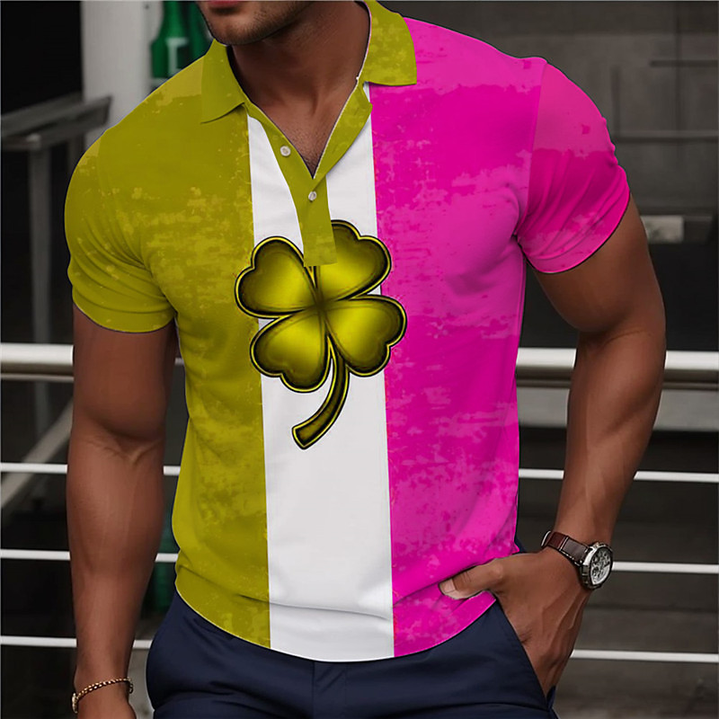 St. Patrick Men's Four Leaf Clover Saint Patrick Day Polo Polo Shirts Short Sleeve Polo Shirts Turndown Casual Vacation St.Patrick's Day Holiday Festival 3D Print Summer Dark Pink Red Orange