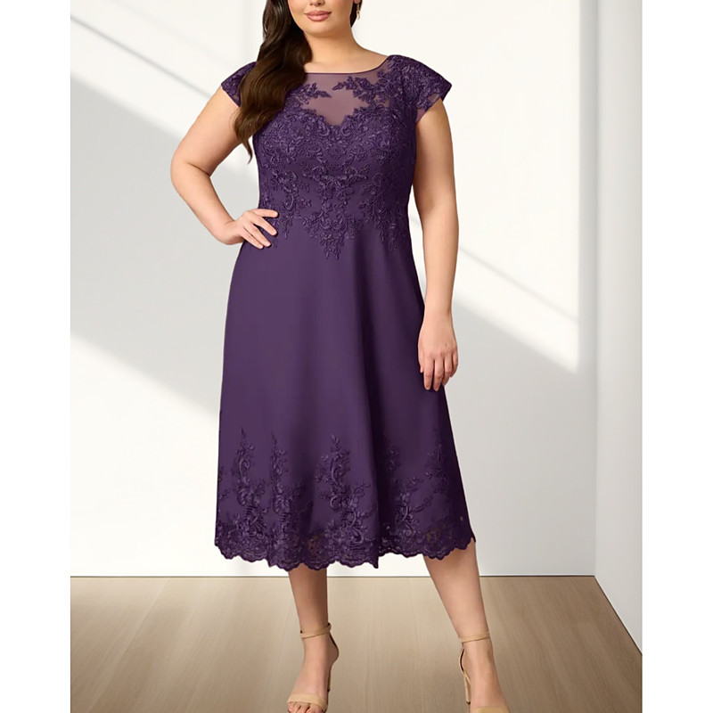 A-Line Tea Length Party Dress Cocktail Dress Wedding Guest Dress Mother of the Bride Dress Short Sleeve Crew Neck Elegant Wedding Guest Engagement Party Chiffon with Appliques