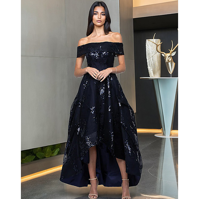 A-Line Asymmetrical Tea Length Beaded Eembroidered Formal Dresses Mother of the Bride Dress Cocktail Dresses Evening Gown Party Dresses Elegant Glittering Celebrity Style Short Sleeve Off Shoulder