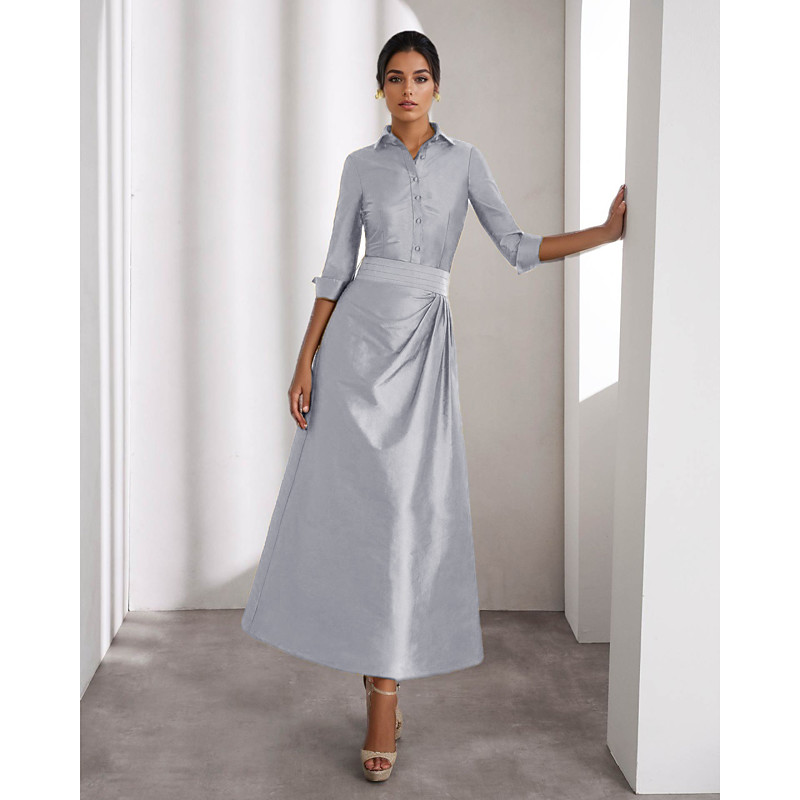 A-Line Ankle Length Shirt Dress Party Dress Cocktail Dress Mother of the Bride Dress Long Sleeve Shirt Collar Elegant Wedding Formal Taffeta with Pleats Slit