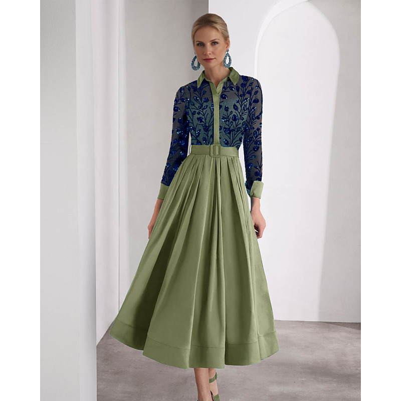 A-Line Ankle Length Beaded Eembroidered Shirt Dress Party Dress Mother of the Bride Dress Long Sleeve Shirt Collar High Neck Elegant Sparkle High Split Formal Wedding Guest Satin with Glitter Slit