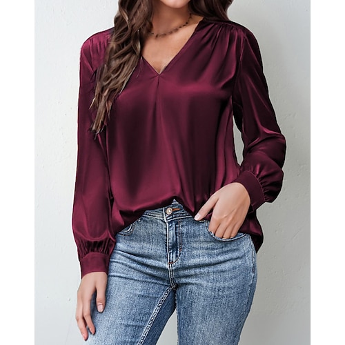 Per donna Camicia Elegant Elegante Raso/Satin Semplice Moderno Casual Manica Lunga Scollo a V Top Regolari Quotidiano Ferie Uscire Arricciato Nero Bianco Giallo Rosa Vino Autunno