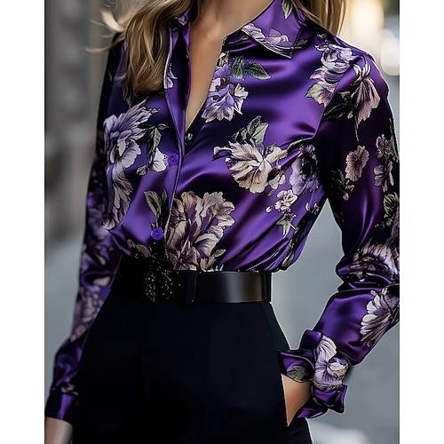 Per donna Camicia da lavoro Floreale Grafico Elegante Casual Manica Lunga Colletto a Camicia Top Regolari Lavoro Abbigliamento da sera Quotidiano Vino Blu Viola Fucsia Primavera, Autunno, Inverno