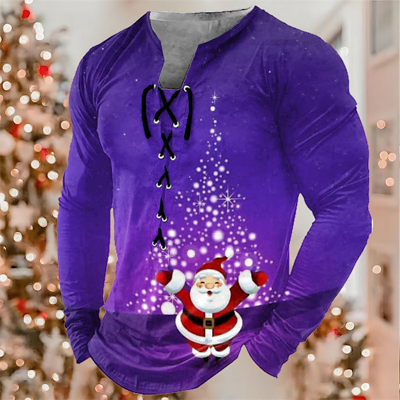 Christmas Men's Santa Claus Henley T Shirt Graphic Tee Santa Claus Collar Green Blue Purple Orange Red 3D Print Outdoor Long Sleeve Lace Up Casual Cotton