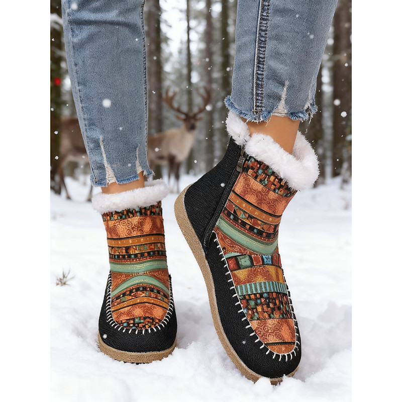 Women's Ethnic Pattern Warm Ankle Boots – Colorful Boho Style Fleece Lined Winter Boots with Side Zipper, Cozy Outdoor Footwear for Travel and Holiday