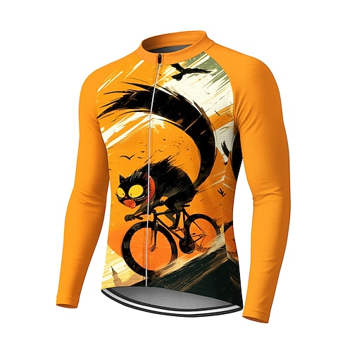 Herren Radtrikot Downhill-Trikot Katze Charakter Kontrastfarbe Langarm Fahhrad T-Shirt Trikot Kompressionskleidung mit 3 Gesäßtaschen Mountainbike MTB Straßenradsport UV-Sonnenschutz Sonnenschutz