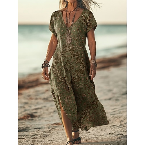 Per donna Abito lungo maxi Abito Boho Vestito Casual Abito a trapezio Abito Stampato Moda Moderno All'aperto Vacanza Weekend Vestibilità comoda Floreale Grafico Manica Corta Scollo a V Vino Verde