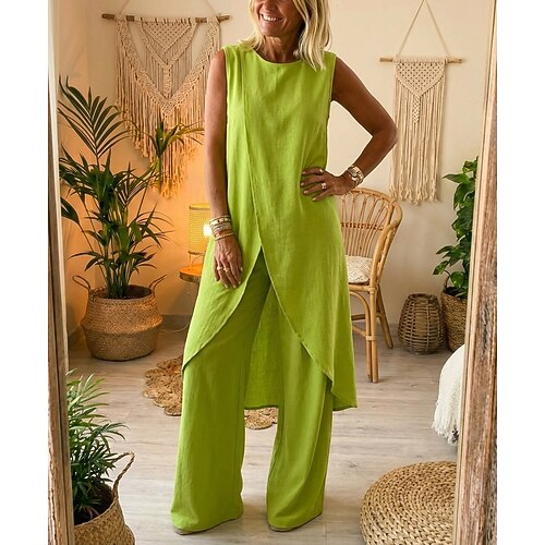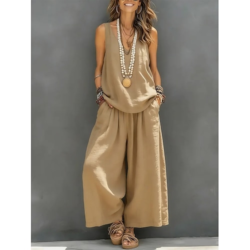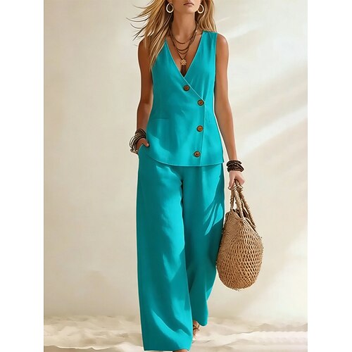 Per donna Set di Pantaloni Finto cotone e lino Senza Maniche Scollo a V Tinta unica Moda Streetwear Casuale Quotidiano All'aperto Blu Bianco Marrone Estate Vestibilità comoda