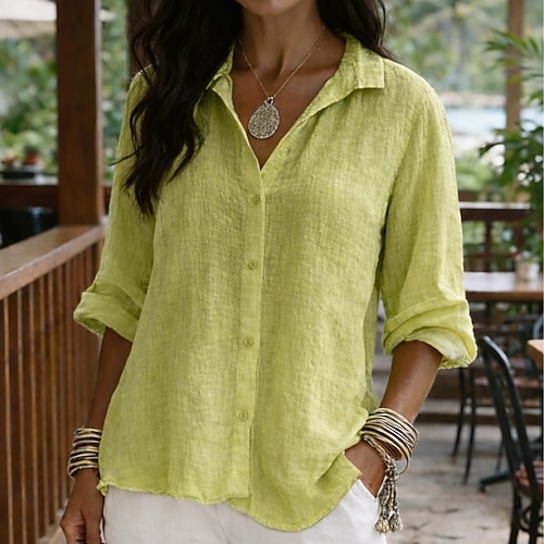 Damen Baumwoll-Leinen Hemd Sommer Hemd Strand Hemd Button-Up Hemd Knöpfe Einfarbig Vintage Stylisch Lässig Langarm Hemd Kragen Alltag Urlaub Urlaub tragen Gelb Sommer Frühling