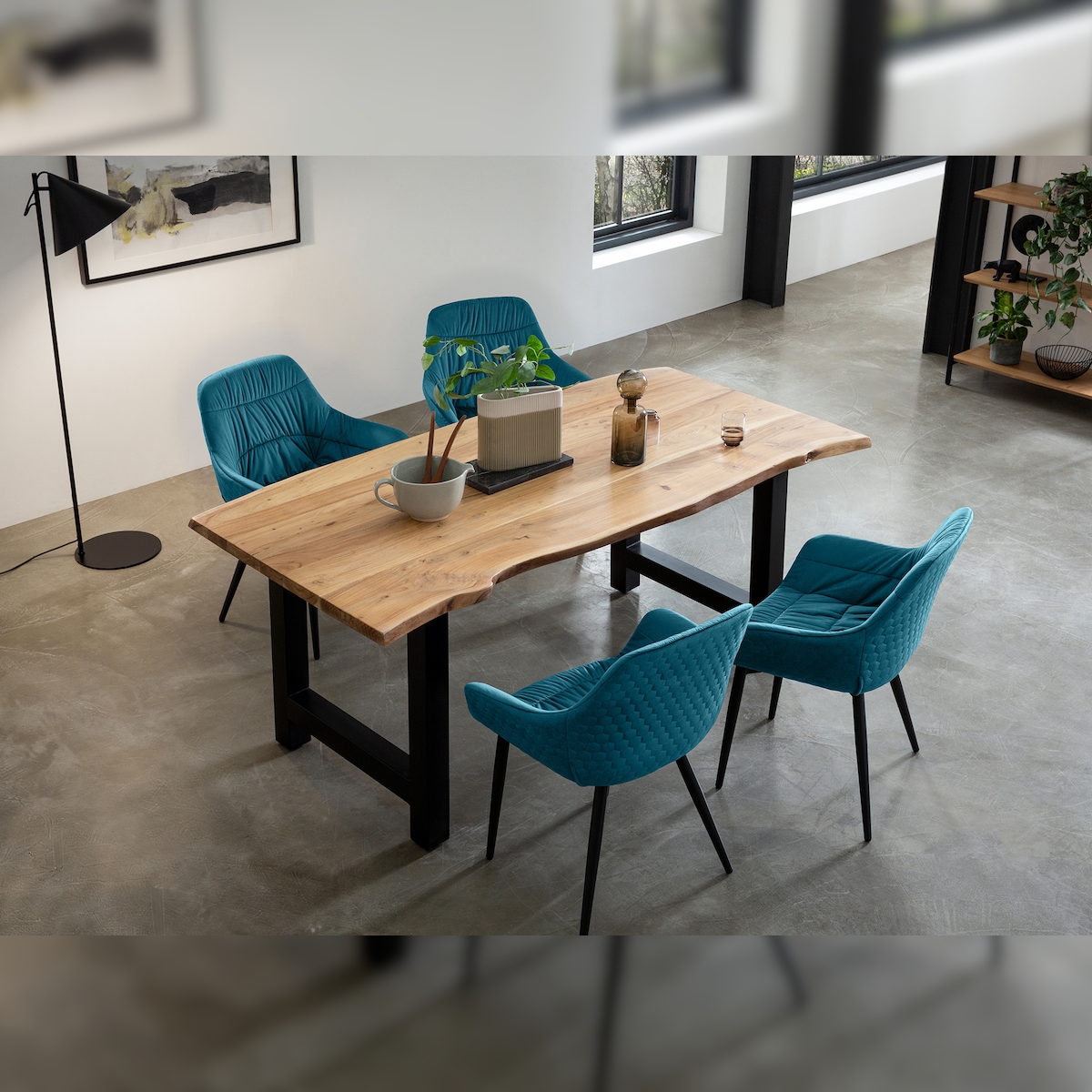 SalesFever Tischgruppe 180 x 90 cm | 5-tlg. | 35 mm Platte Akazie natur | H-Gestell Metall schwarz | 4 Stühle aus Samt | türkis – schwarz