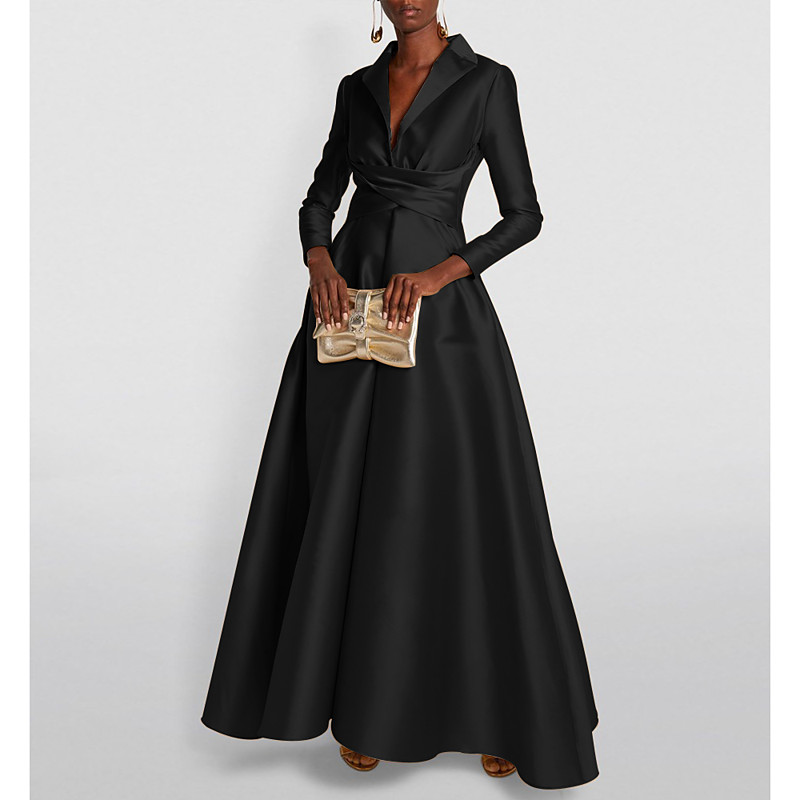 A-Line Floor Length Wedding Guest Dress Formal Dresses Flare Dress Mother of the Bride Dress Long Sleeve Shirt Collar Elegant Formal Wedding Guest Satin with Ruched