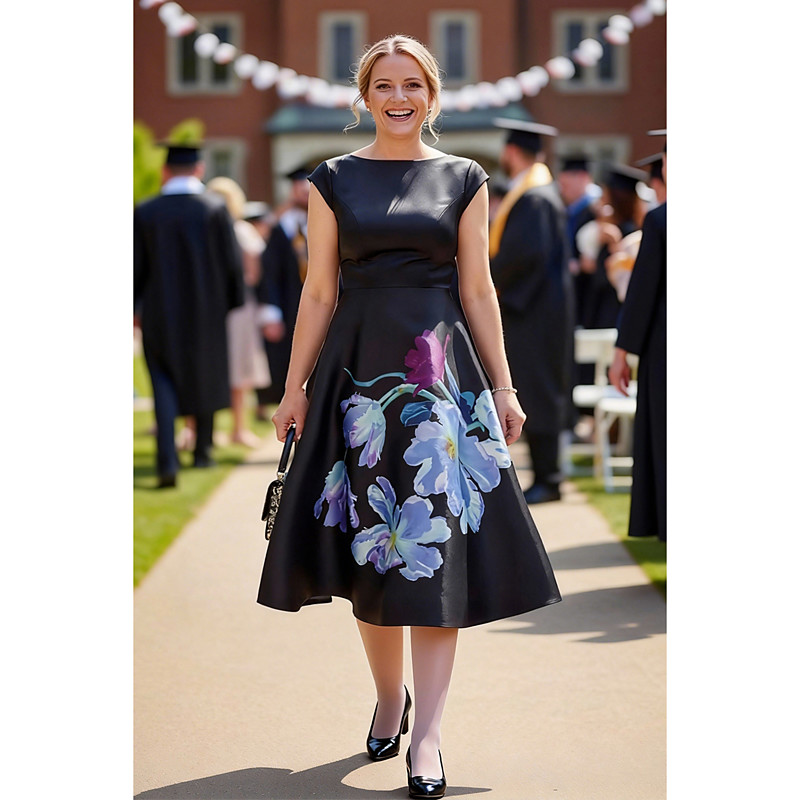 A-Line Tea Length Party Dress Cocktail Dress Wedding Guest Dress Mother of the Bride Dress Short Sleeve Boat Neck Elegant Vintage Pinstripe with Flower