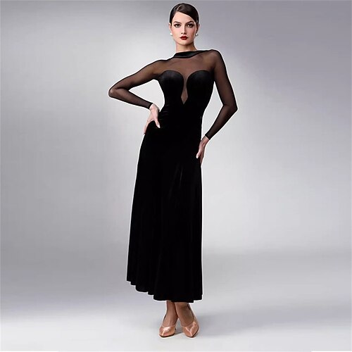 Ballsaal-Tanzkleid für Damen, schwarzer Samt, transparentes Netz, lange Ärmel, elegant, Tango, Rumba, Foxtrott, Wettkampf-Performance-Kleid