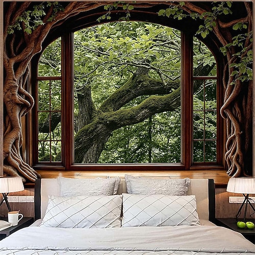 arazzo con motivo di finestra con paesaggio innevato, grande decorazione murale da appendere alla parete, tessuto per sfondo fotografico, arredamento per la casa per camera da letto, soggiorno o