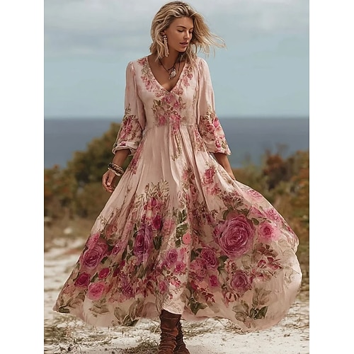 Per donna Abito Midi Abito a trapezio Festa Casual Boho Spiaggia Data Vestibilità comoda Floreale Grafico Manica Lunga Scollo a V Rosa Estate Primavera