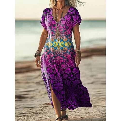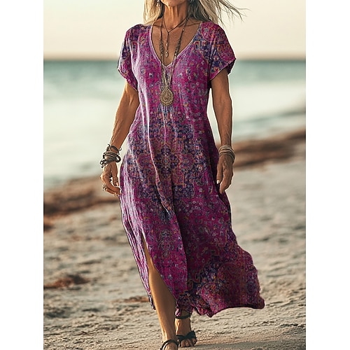 Per donna Abito maxi Abito Boho Vestito Casual Abito a trapezio Abito Stampato Vintage All'aperto Vacanza Weekend Vestibilità comoda Floreale Grafico Manica Corta Scollo a V Viola Estate Primavera