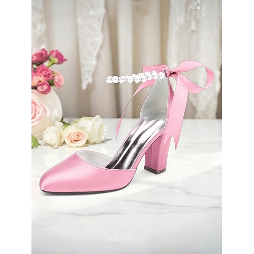 Damen Pumps aus orangefarbenem Satin mit Blockabsatz und Perle Knöchelriemen aus Band – elegante High Heels mit spitzer Spitze für Hochzeiten, Partys Abendveranstaltungen