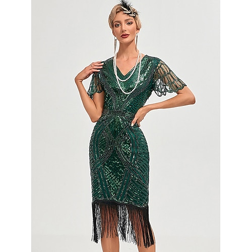 Anni Ruggenti Anni 1920 Lunghezza al ginocchio Abito Flapper Maniche corte Il grande Gatsby Ragazza Flapper Paillettes Frange Scollo a V Costume Per donna Natale Carnevale Festa serale Mascherata
