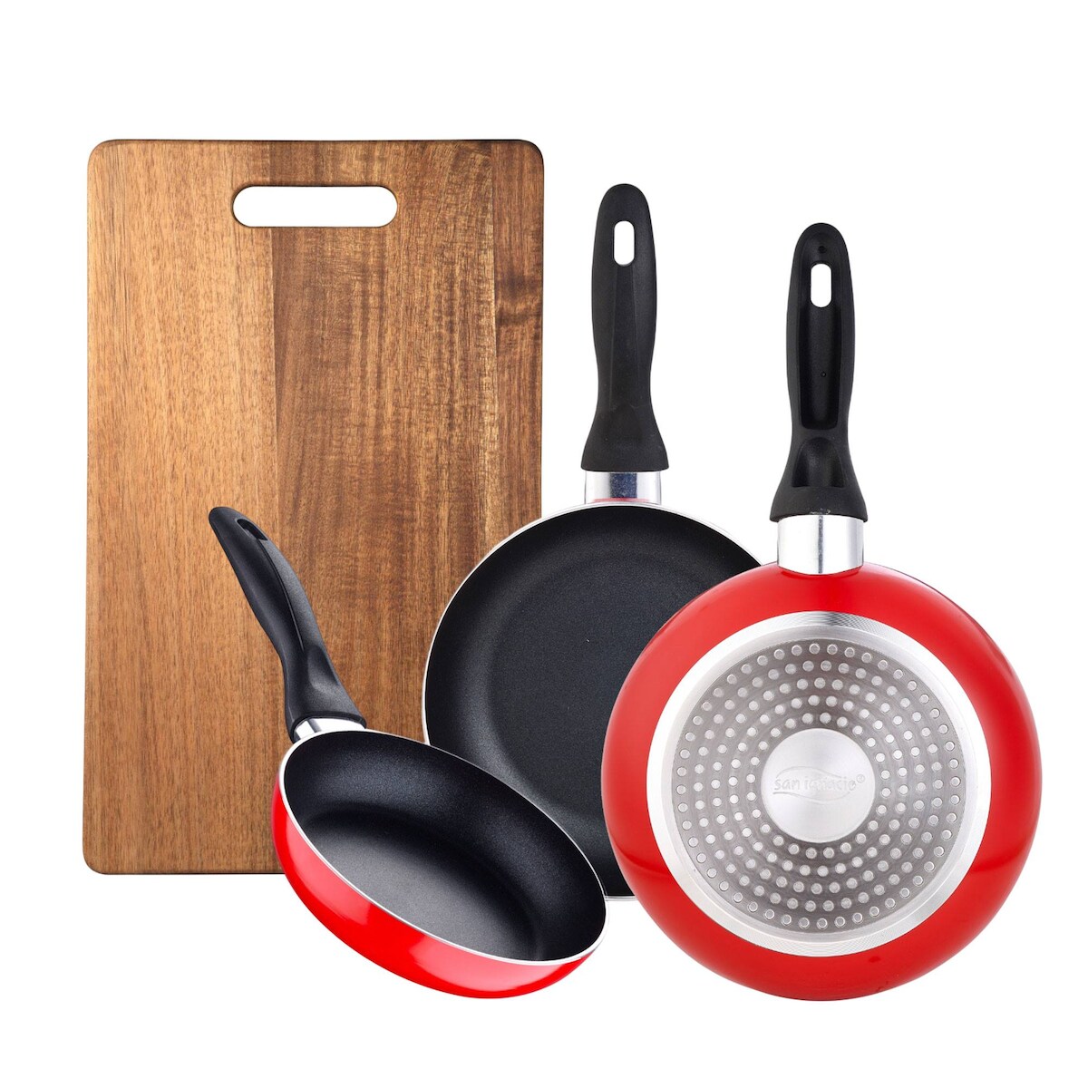 BERGNER - Set aus 3 Pfannen Ø16/Ø20/Ø24 cm aus gepresstem Aluminium, geeignet für Induktion Navy Red Schneidebrett 40,3x25,2x2,5 cm aus Holz