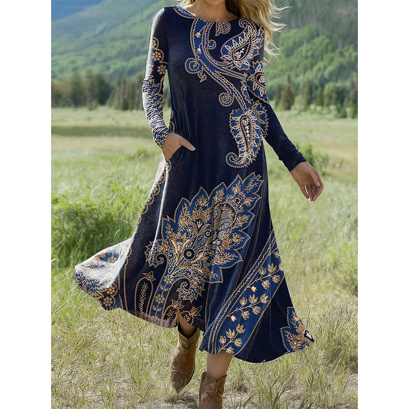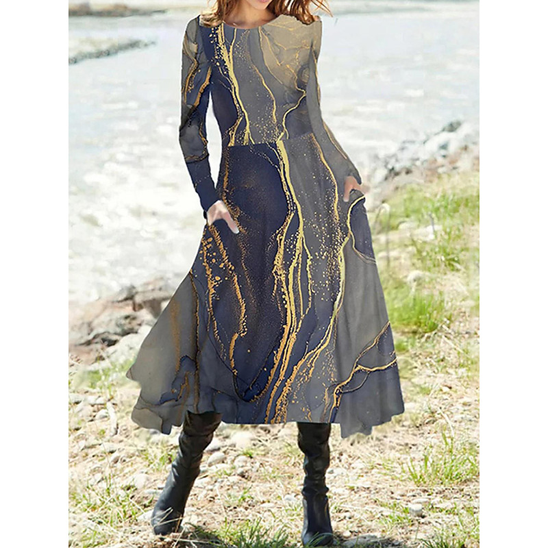 Women's Midi Dress A Line Dress Fit And Flare Dress Vacation Casual Daily Regular Fit Graphic Geometric Long Sleeve Crew Neck Black Blue Orange Spring Fall Winter
