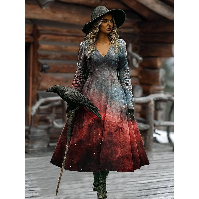 Women's Midi Dress A Line Dress Vacation Casual Boho Beach Regular Fit Graphic Abstract Long Sleeve V Neck White Dark Red Wine Brown Spring Fall Winter