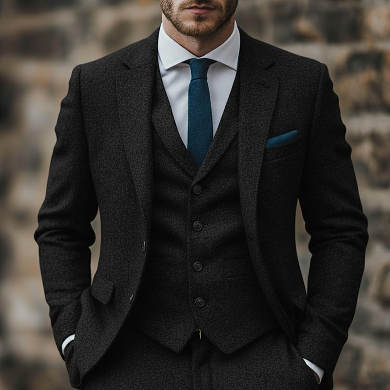 Men's Business Casual Tweed Suits Notch Lapel Black Light Grey Business Formal Solid Colored Tailored Fit 3 Piece Single Breasted Two-buttons