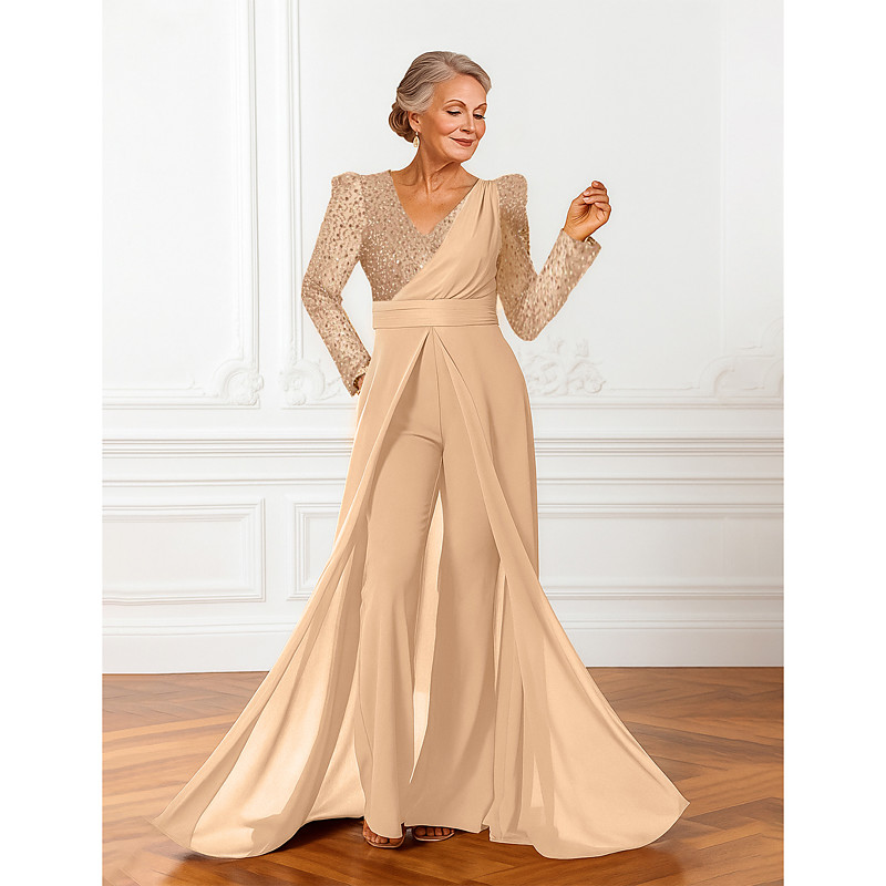 Jumpsuits Floor Length Mother of the Bride Dress Long Sleeve V Neck Elegant Sparkle Shine Formal Wedding Guest Wedding Party Chiffon with Sash / Ribbon Sequin