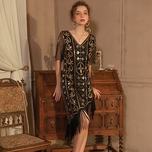 Anni Ruggenti Anni 1920 Lunghezza al ginocchio Abito Flapper Senza maniche Il grande Gatsby Ragazza Flapper Paillettes Frange Scollo a V Costume Per donna Natale Carnevale Mascherata Festa a tema