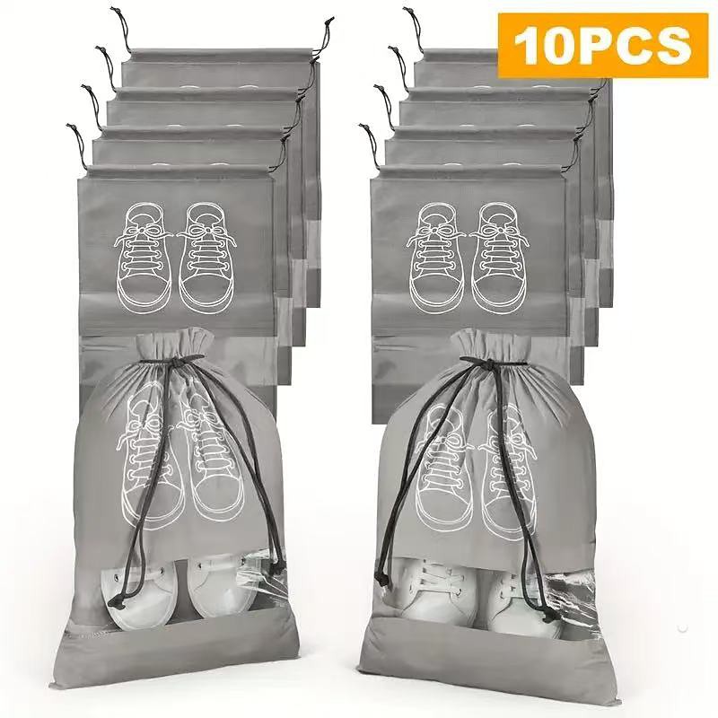 10-Pack Travel Shoe Storage Bags, Non-Woven Dustproof Shoe Organizers with Drawstring Closure, Transparent Window and White Shoe Print Design