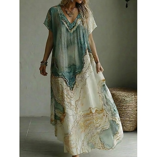 Per donna Abito maxi Vestito Casual Abito Stampato Elegante Moda Moderno All'aperto Vacanza Uscire Vestibilità comoda Marmo Manica Corta Scollo a V Blu Estate Primavera