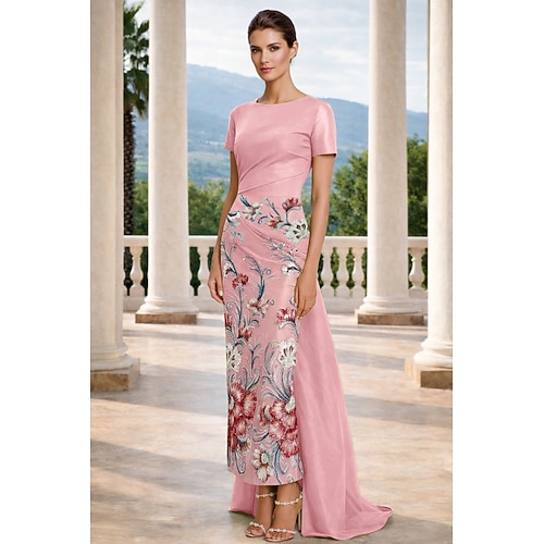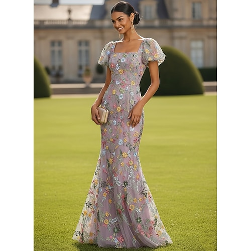 Sirena Tromba Lunghezza al pavimento Abito da Sera Elegante Scintillante Floreale Manica Corta Scollo a V Festa serale Festa in giardino Raso Tulle con Stampa floreale Fiore ricamato Ricamo