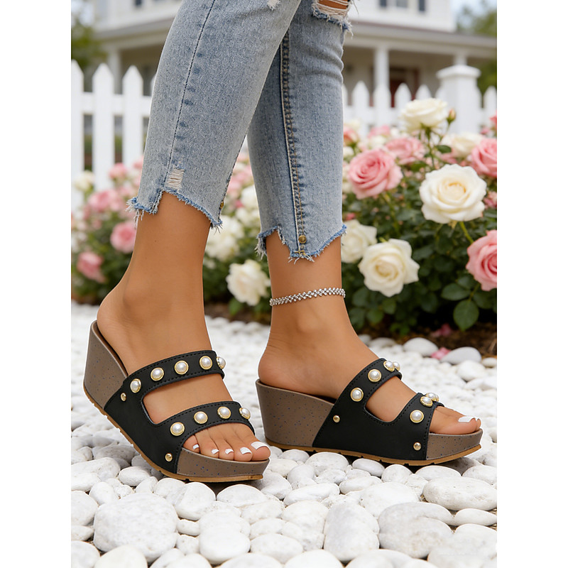 Women's White Platform Slide Sandals - Stylish Double-Strap Design with Faux Pearls Metallic Accents, Perfect for Summer Garden Parties and Casual Outingsand Vacation