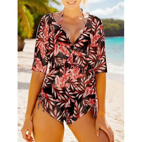 Costume da bagno 3 pezzi da donna bikini con palme,cheeky slim senza schienale per vacanze in spiaggia floreale color block scollo a V senza maniche maniche lunghe