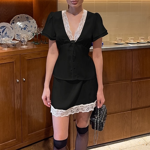 Per donna Set da due pezzi Set di gonne Manica Corta Scollo a V Semplice Pizzo Moda Streetwear Casuale Quotidiano All'aperto Nero Bianco Giallo Estate Vestibilità regolare