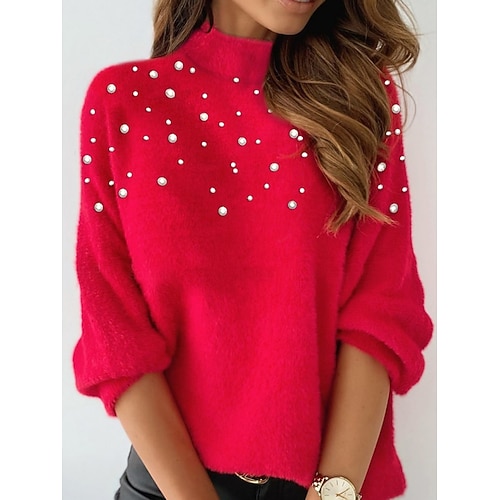 Per donna Blusa Tinta unica Elegante Casual Manica Lunga Collo alto Top Regolari Quotidiano Con perline Nero Giallo Rosa Rosso Marrone Primavera Autunno Inverno